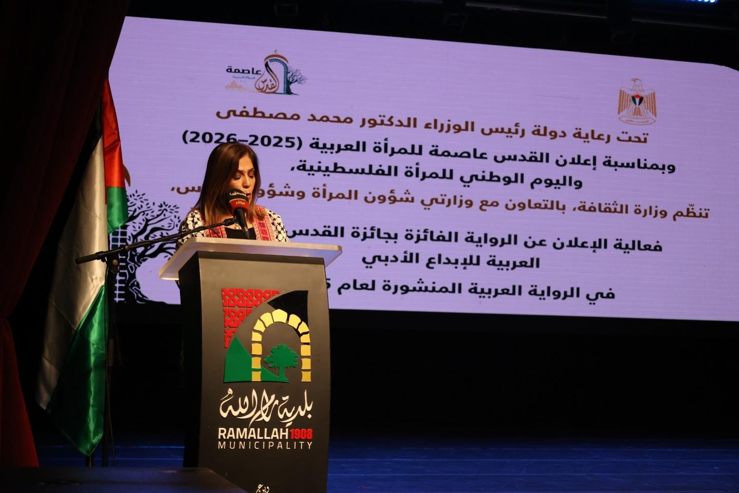 وشهد الحفل كلمات لكل من وزيرة شؤون المرأة منى الخليلي وزير الثقافة الأستاذ عماد حمدان، ووزير شؤون القدس الدكتور أشرف الأعور، حيث أكد المتحدثون على رمزية هذا اليوم الذي يجمع بين الاحتفاء بالقدس عاصمة للمرأة العربية، واليوم الوطني للمرأة الفلسطينية، باعتباره مناسبة لتجديد الالتزام بدعم المرأة وتمكينها في مختلف المجالات. كما تم الإعلان عن الرواية الفائزة بجائزة القدس للمرأة العربية للإبداع الأدبي لعام 2025، وهي رواية الكاتبة الليبية عائشة الأصفر، التي نالت الجائزة تقديراً لقيمتها الأدبية ورسالتها الإنسانية.