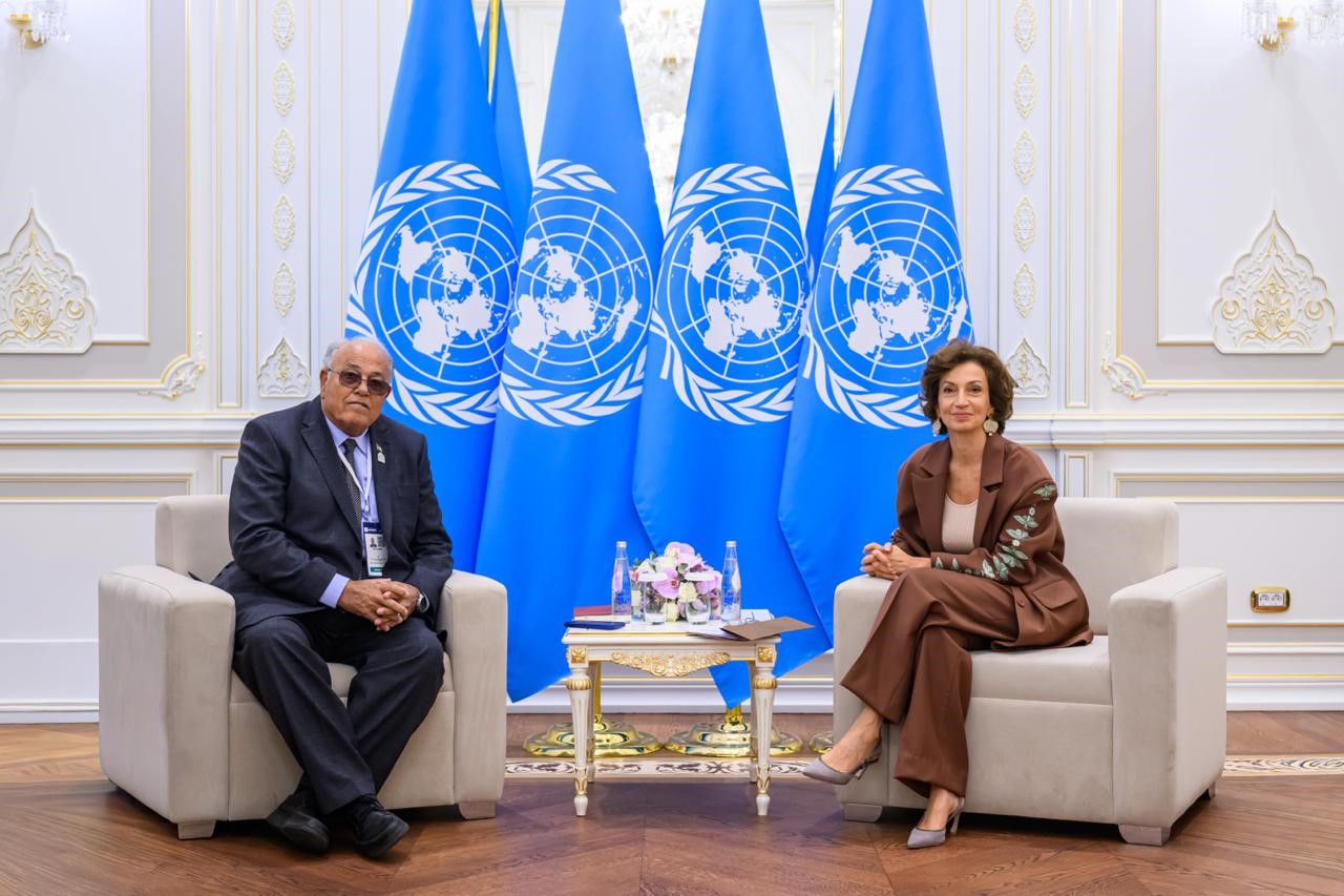 سمرقند - نساء FM- بحث عضو اللجنة التنفيذية لمنظمة التحرير الفلسطينية، رئيس اللجنة الوطنية الفلسطينية للتربية والثقافة والعلوم علي زيدان أبو زهري، مع المديرة العامة لمنظمة الأمم المتحدة للتربية والعلم والثقافة "اليونسكو" أودري أزولاي، الوضع التعليمي الكارثي في قطاع غزة، وسبل الاستجابة العاجلة من خلال البرنامج الطارئ للتعليم الذي تنفذه المنظمة.
