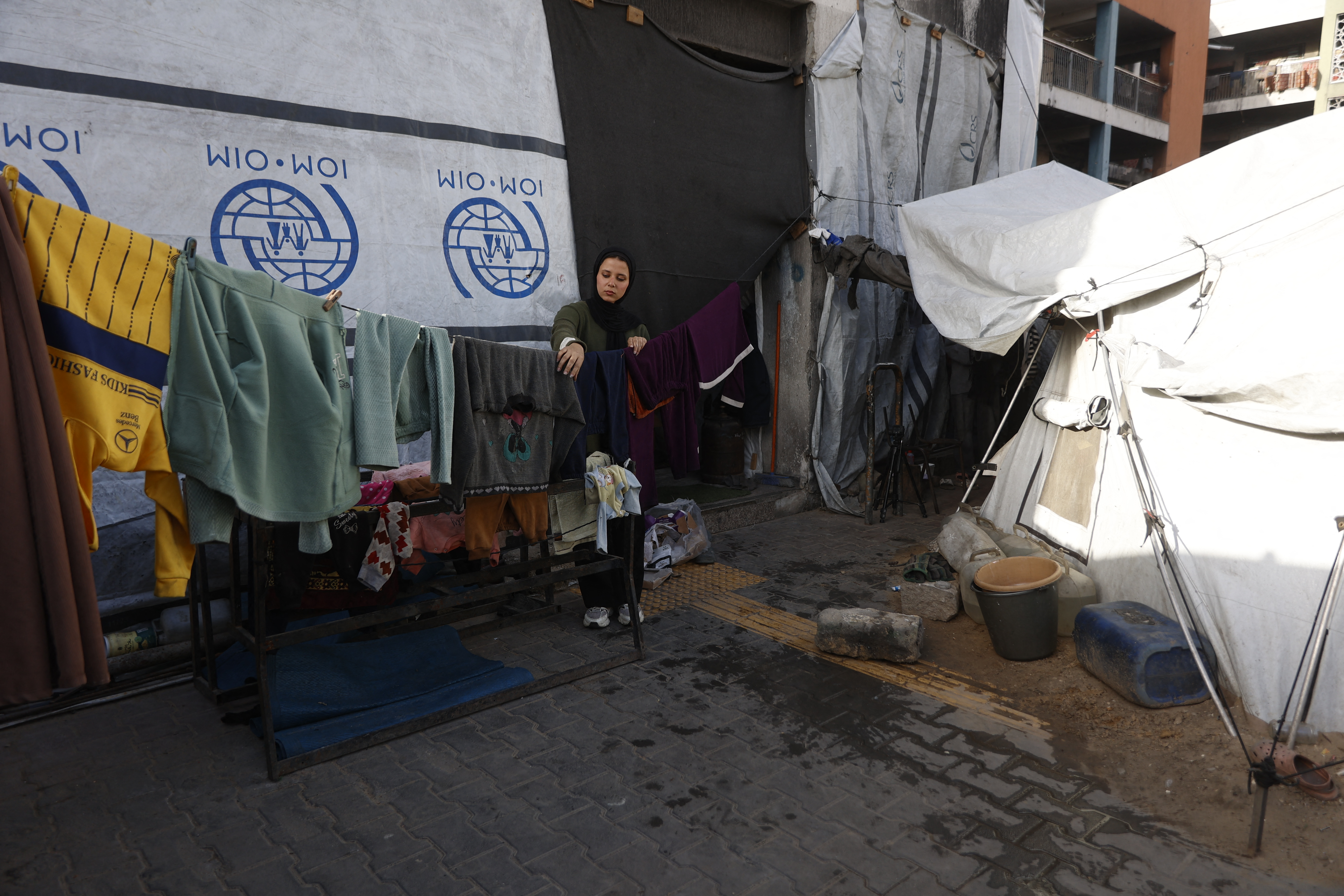تعلق على قماش الخيمة، لكنها في الحقيقة تعلق على جدار الروح، لتقول إن الجمال ما زال ممكنا حتى في قلب الركام.