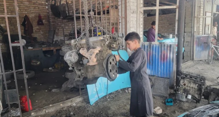 كابل-نساء FM- في سوق "مندوي" الصاخب وسط العاصمة الأفغانية كابل، يجلس عبد الرؤوف خليلي (12 عاما) أمام إطار دراجة نارية، يحاول إصلاحه بأدوات بالية بينما الزيت يغطي يديه الصغيرتين.